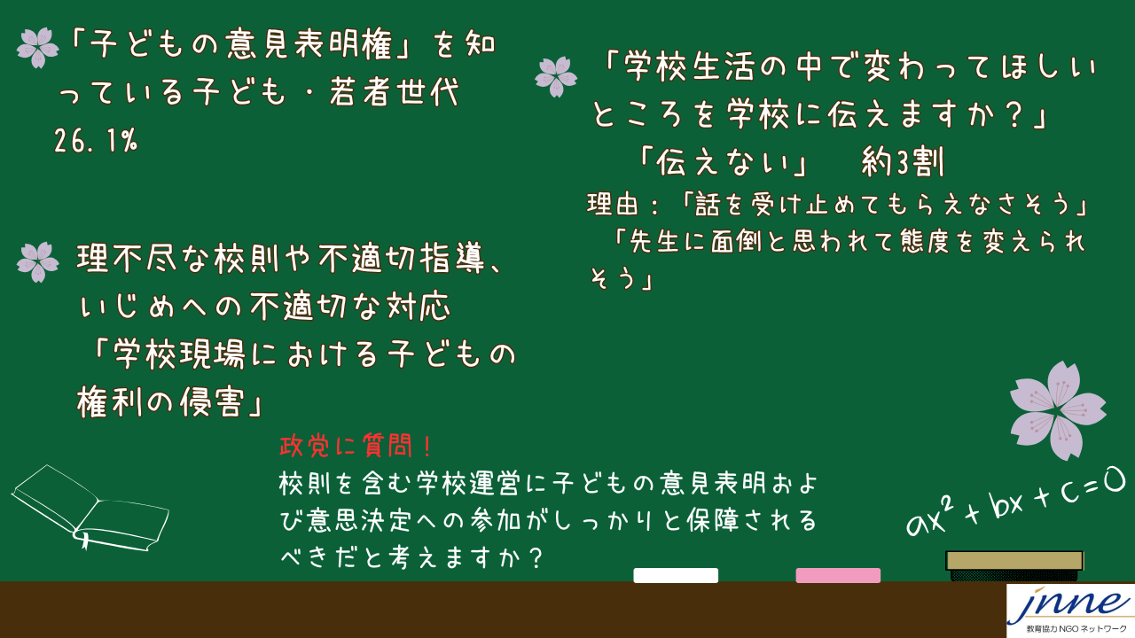 | E党 | E党は、「行き過ぎた校則で子どもたちの尊厳が傷つけられることがあってはならない」と考え、子どもたちの意見表明・意思決定のため、児童生徒、保護者、教職員が互いに話し合いながら、校則や学校行事などを決めていく「学校内民主主義」の実現に取り組んできました。 そして、生徒指導の手引書である「生徒指導提要」の12年ぶりの改訂を後押しし、校則見直しの際に、子どもの意見を聞くことが推奨されることになりました。学校運営に子どもの意見表明および意思決定への参加がしっかりと保障されるために、これからも子どもの意見表明・意思決定ができる学校内民主主義を進めていきます。 | |||||||