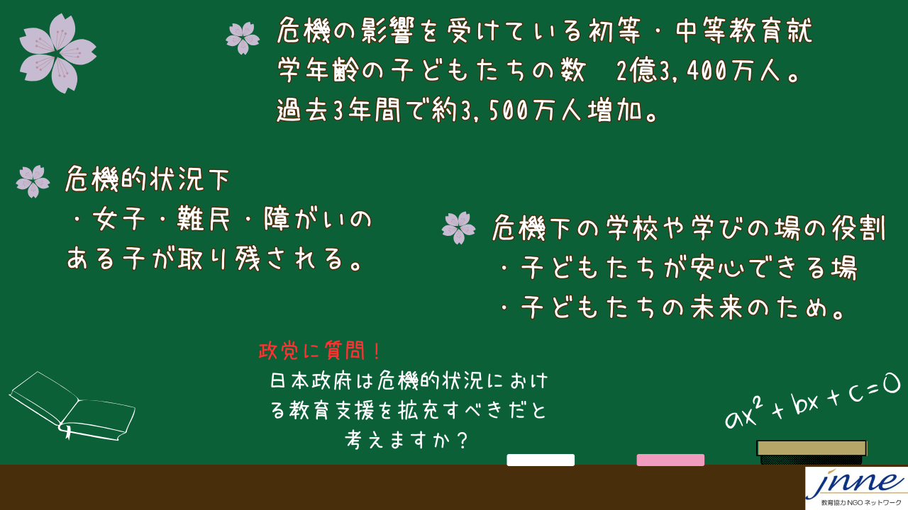 | A党 | 戦争、長期間の紛争、大規模災害等によって、学校教育を受けられない状況に置き去りにされた子どもたちに対しては、当事国にのみ任せるのではなく、国際社会の積極的な支援が必要です。難民の子ども、紛争下における女子は、特に不利な状況に置かれているという調査もあります。この事態を放置することは人権の問題だけでなく、当該地域の将来の安定の芽を摘むことにもなり、周辺国の不安定化を招きかねません。 日本は、国際教育協力政策を見直し、日本は2023年に基金への支援を開始しましたが、ECWに拠出を充実させることを「平和外交」の一環として位置付けることも必要です。 | |||||||