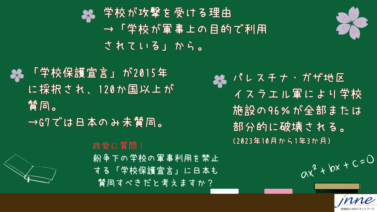| C党 | 学校は、もっとも安全であるべき施設の一つです。学校への軍事的攻撃は、学校を破壊し、子どもたちを傷つけるだけでなく、子どもたちの未来への希望を打ち砕くたいへん卑劣な行為です。ウクライナやガザなどで学校が戦闘に利用され、攻撃目標となっていることを見るにつけ、学校、生徒・学生、教育関係者への攻撃・暴力を禁じ、学校を安全地帯にするための学校保護宣言をさらに広げることが大切だと思います。「G7諸国で同宣言に賛同していない国は日本のみ」というのは恥ずべきことであり、日本も宣言に賛同、参画すべきと考えます。 | |||||||
