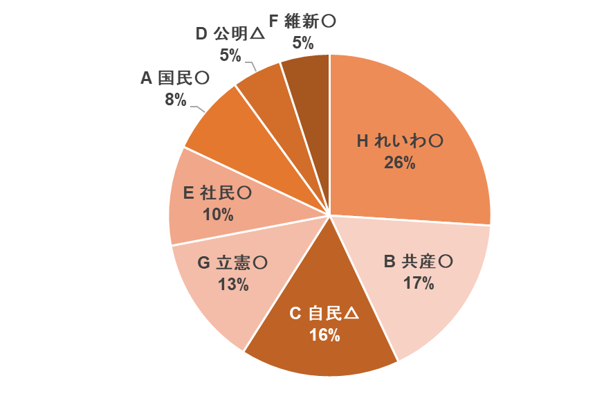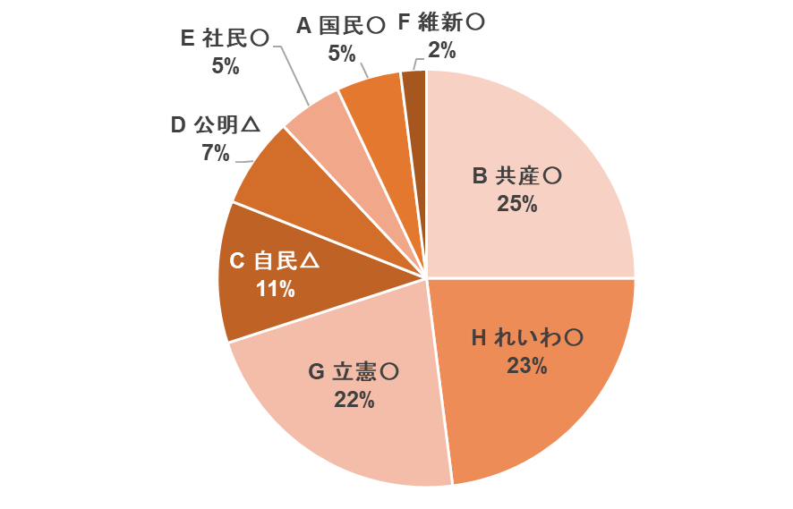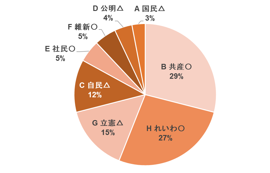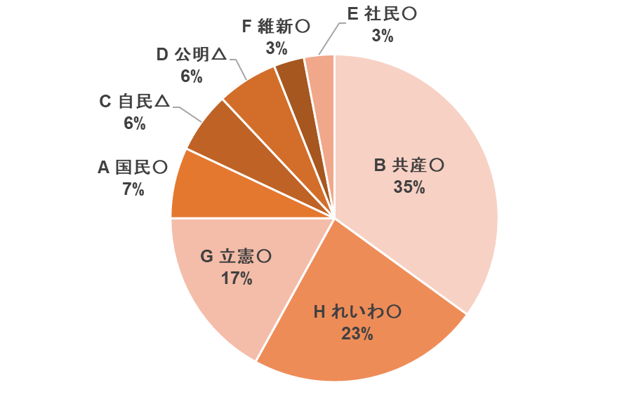 2022年4月1日~5月31日の間に、全国から多くの方が投票アクションにご参加くださり、オンライン&授業で4,383件の投票が寄せられました。投票は政党名を伏せた状態で、回答順にA~H党として賛同できる党を選ぶ形で実施しました。